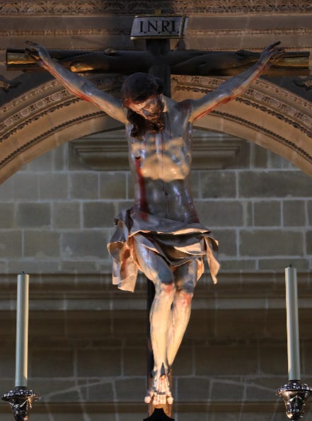 It was an older fashioned one, and the artist had either leaned as hard as he could into depicting the Passion as realistically as possible, or had ended up with extra red paint and decided to use it. Blood streamed from Christ’s forehead, dripped from his shoulders, ran down his arms, stained his knees, and ran down his side.